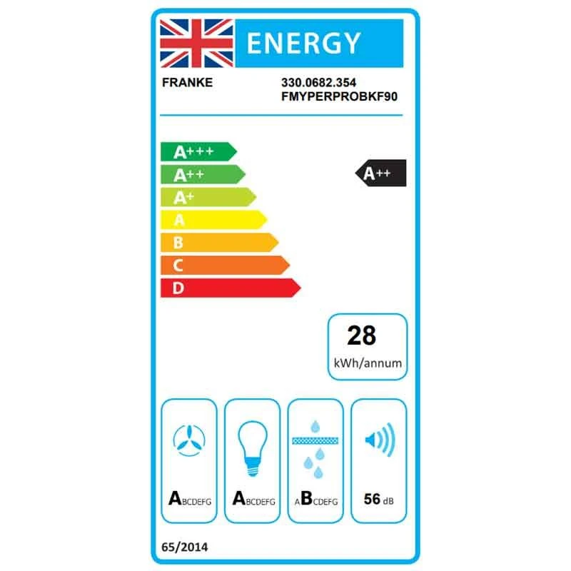 The Frank Mythos Per Pro 90cm Angled Cooker Hood comes in a stunning black colour with a modern vertical design and wall installation. Alongside its 3 speed settings, this product also features 2 additional boost settings so you can actively increase the airflow when necessary. With an energy efficient Energy class A++ rating, the Franke Mythos Angled Cooker Hood is the ideal choice for a busy kitchen.